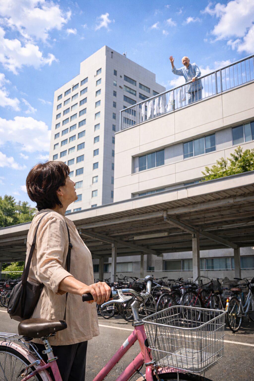 ある日のこと、面会が終わって帰る際に自転車置き場からふっと屋上を見上げると、見知らぬ老人が立っていた。なんとなく会釈をすると、老人はこちらに手を振ったんだそうです。